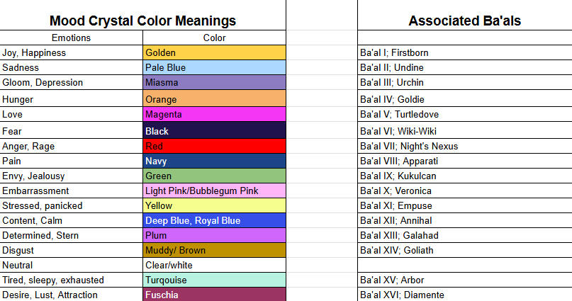 Tatiana carries with her a crystal that changes color based on the emotion that is most prevelant at the time, and shines brighter the closer she gets to the source of said emotion. If you wish to have your emotions displayed; or to take place in an rp involving a Ba'al, simply send a tell or a whisper!